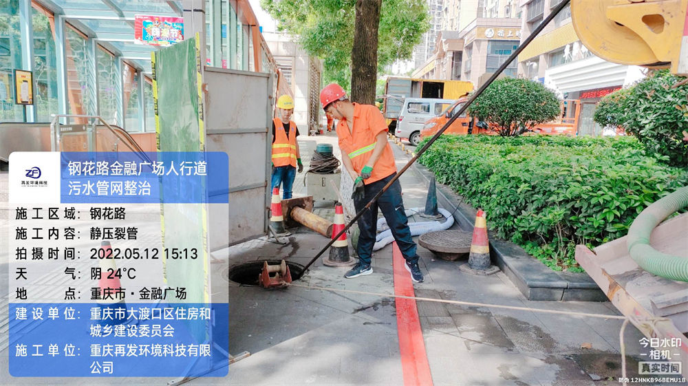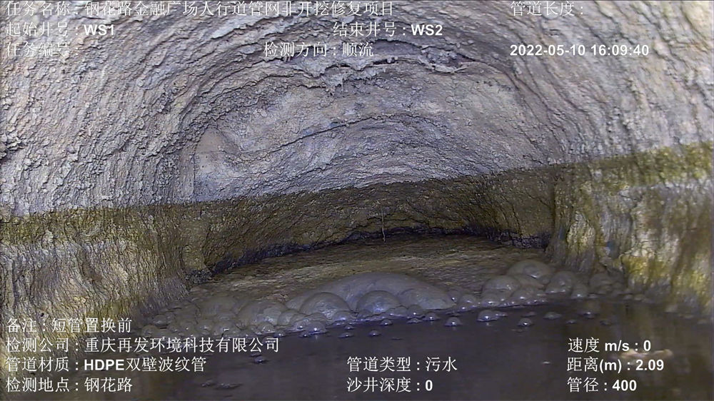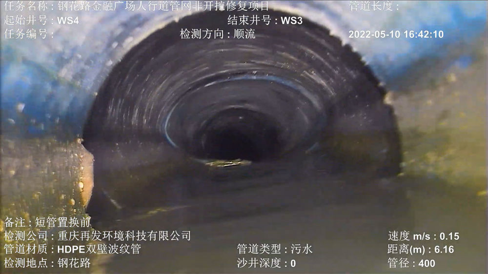 另外还出现雨水渗入污水管网的情况。由于周边人流密集,且人行道布设有其他管线。技术人员经研究决定,采用非开挖修复短管内衬工艺,对问题管网进行修复,避免了对小区车库造成车辆财产损失,和间接产生的生态环保隐患。